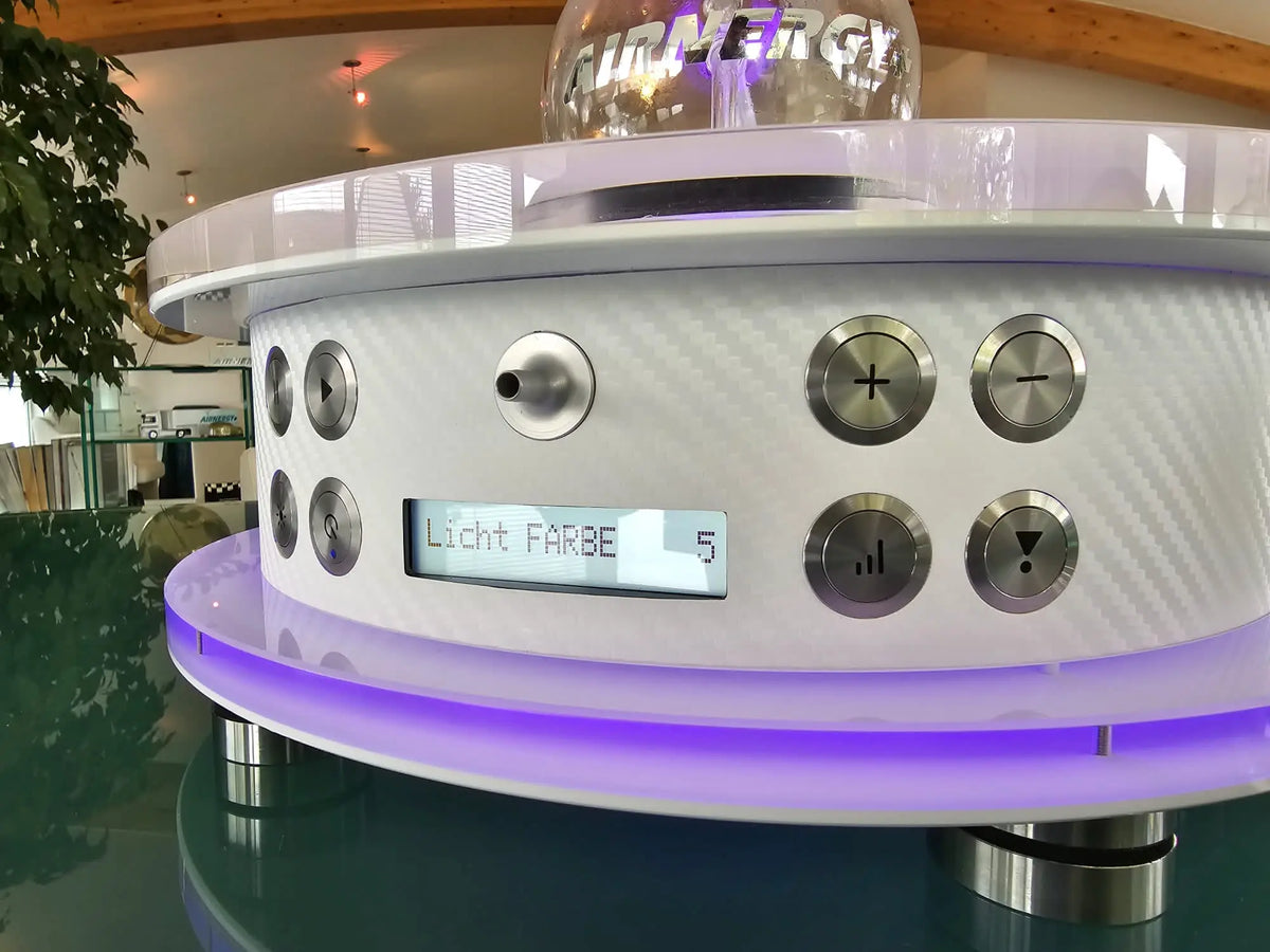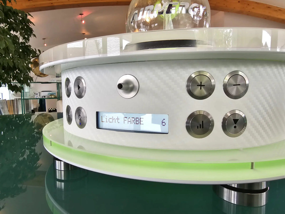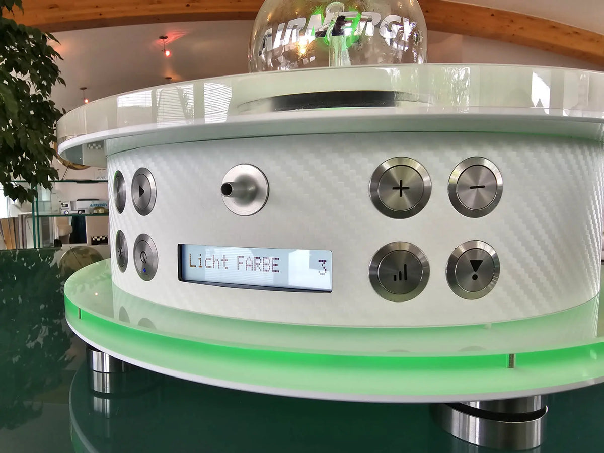Räumlich durch eine Glasscheibe getrennt befinden sich in der Aktivierungseinheit im unteren Teil des Airnergy Vitalisators Katalysatoren und Sauerstoff.